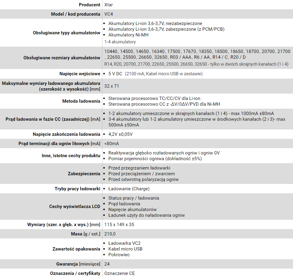 | Ostrzeżenia | Nie demontować ładowarki samodzielnie., Unikać kontaktu z wodą i wilgocią., Używać tylko z odpowiednimi akumulatorami. |
