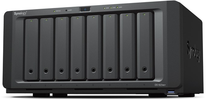 NAS Synology DS1823xs+; Tower; 8x (3.5″ SATA HDD/2.5″ SATA SSD); AMD Ryzen V1780B, 8 GB DDR4 ECC SODIMM (max. 32GB), 2x 1GbE RJ-45, 1x 10GbE RJ-45